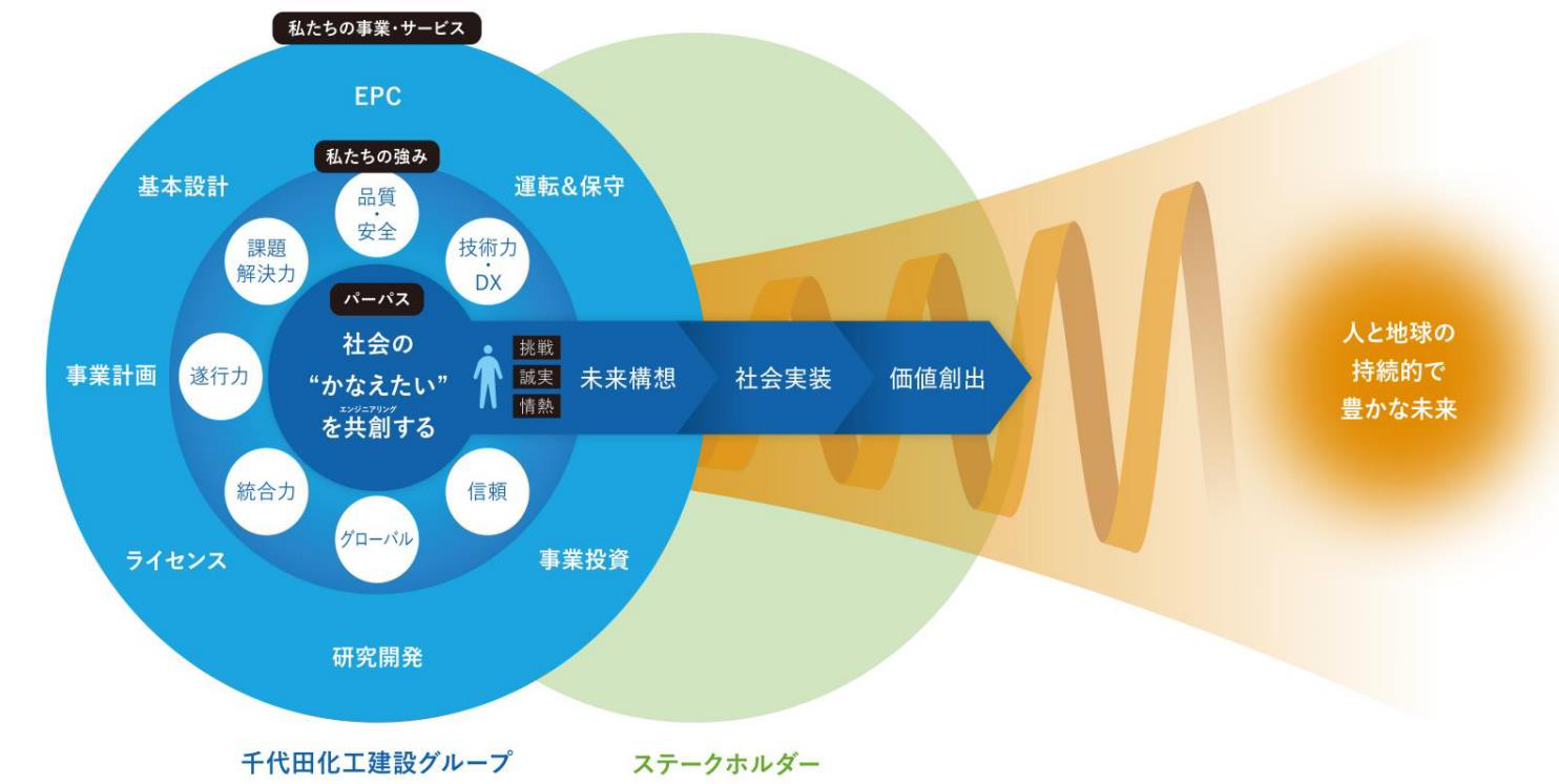 私たちは、パーパス「社会の"かなえたい"を共創(エンジニアリング)する」の下、英知を結集し研鑽された技術を駆使し、エネルギーと環境の調和、健やかで豊かな未来を目指して事業の充実を図り、持続可能な社会の発展に貢献します。