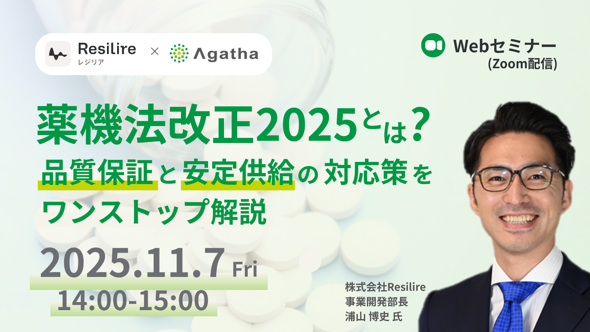本Webinarでは、文書・品質管理領域に強みを持つアガサと、サプライチェーン管理や安定供給の実現をサポートする株式会社レジリアが共催し、2025年5月に公布され、11月から段階的に施行予定の薬機法改定を背景に、現場で想定される課題を整理。そのうえで、各社のソリューションで、品質管理及び安定供給を支援する具体的な方法についてご紹介いたします。