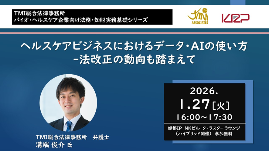 本セミナーでは、TMI総合法律事務所 溝端 俊介弁護士を講師に迎え、ヘルスケアビジネスに適用されるデータ関係の規制の全体像をわかりやすく説明したうえで、規制の解説にとどまらない、データ・AIの「使い方」を解説いただきます。
