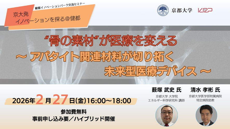 本イベントでは、「アパタイト」の科学を軸とする生体活性セラミックスのテクノロジーを基調とした新規医療材料に関する基礎から医療応用までの幅広い研究に長年取り組んできた京都大学の研究者2名をお迎えします。それぞれの立場から、アパタイトに関連する生体活性複合材料がなぜ注目されているのか、未開拓のどのような材料特性が次世代の臨床に活かされるのか、今後どのような研究・技術展開が期待されるのかまで、アパタイト関連材料を起点に未来型医療デバイスの可能性や研究の現在地、課題、将来像を俯瞰的に考える機会とします。