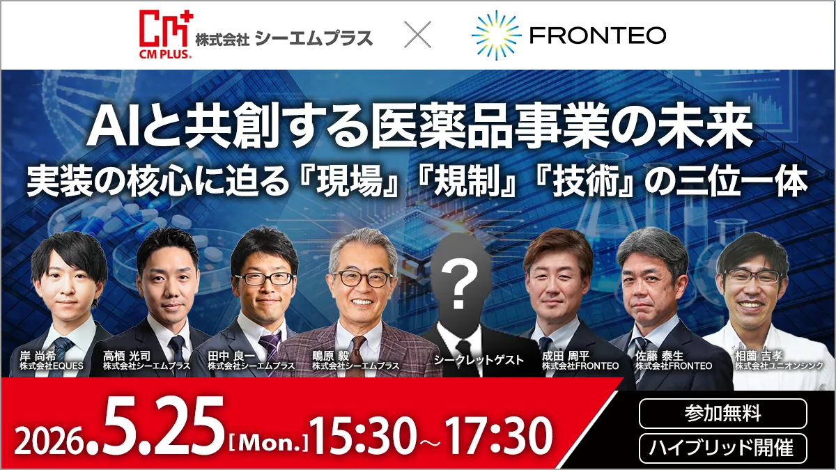 リーガルテックをルーツに高度なAIソリューションを展開するFRONTEOと、製薬施設のエンジニアリングおよびGMPコンサルティングに精通したシーエムプラスが連携し、製薬業界におけるAI活用の「理想と現実」を多角的に考察します。