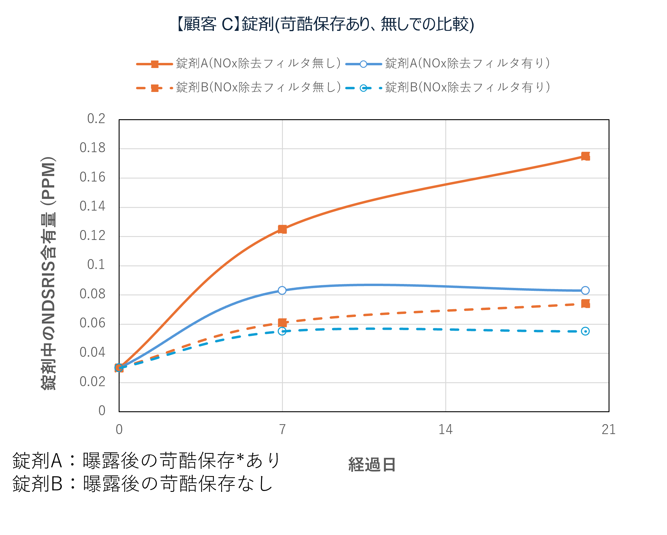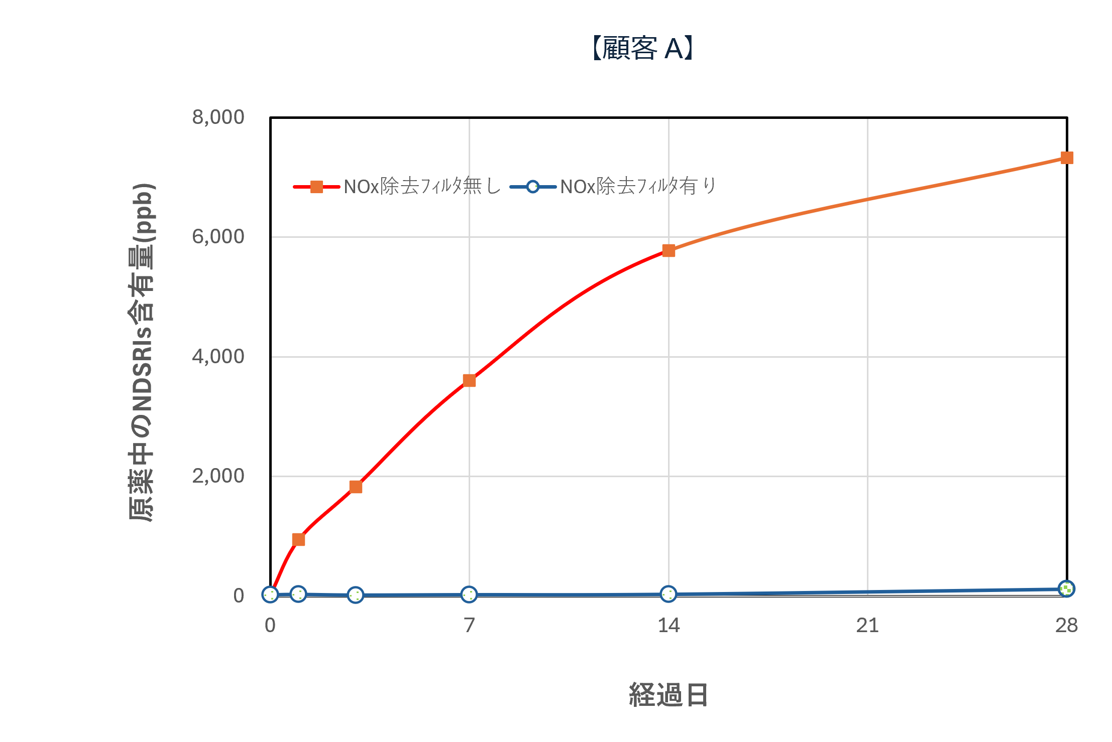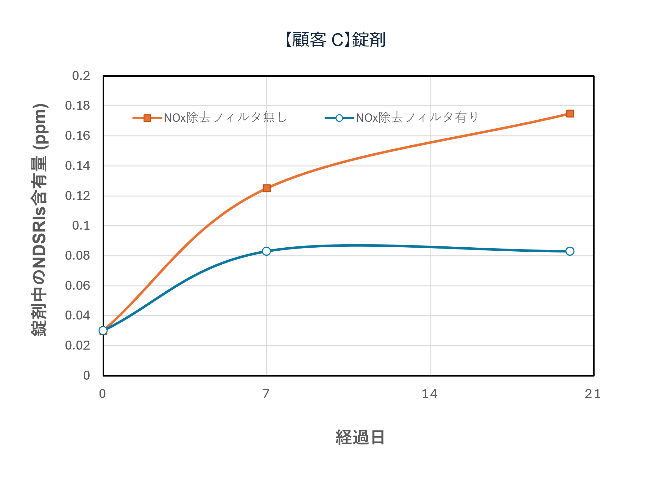 テスト機によるNOx除去フィルタの有無で原薬中のNDSRIs(ニトロソアミン不純物)含有量の変化を確認
