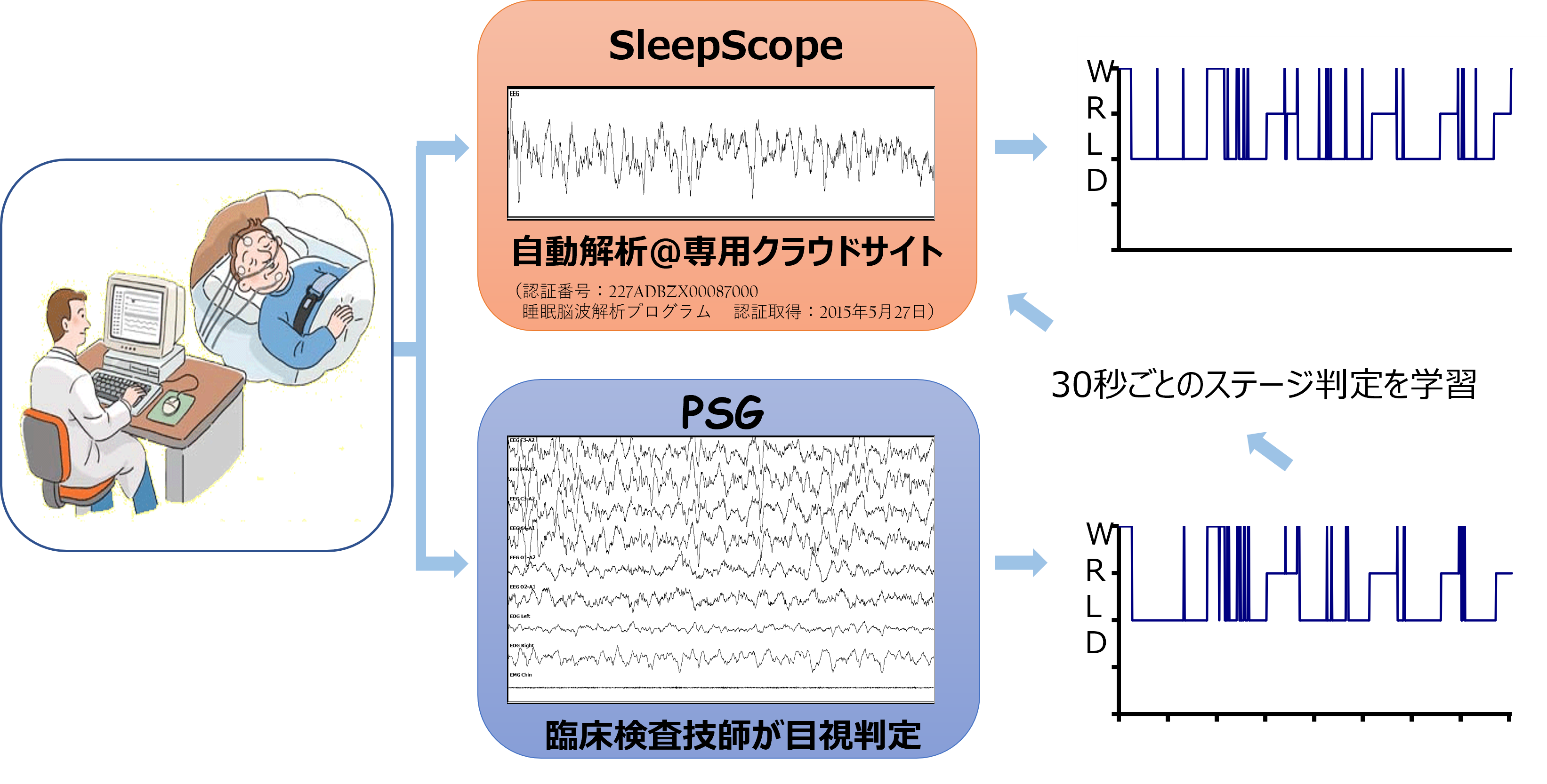 1.PSGとの高い一致率 2.再現性は100% PSGとの同時計測データ(2000データ:192万ラベル)を利用した機械学習による正確なプログラム |
