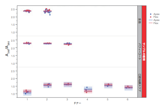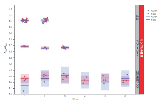 NanoDrop dsDNAモジュールを使用して、全抽出サンプルの純度の解析を行いました。KingFisher FlexおよびKingFisherApex の両システムを用いて処理した全血サンプル(200 µL、400 µL、1 mLおよび2 mLのインプット容量)、バフィーコートサンプルおよび口腔粘膜スワブサンプルの抽出物は、それぞれ同等の吸光度比(A260/A280およびA260/A230)を示しました(図9および10)。この結果は、KingFisher Apexシステムで処理したサンプルとKingFisher Flexシステムで処理したサンプルのDNA の純度が同等であることを示しています。図10は、口腔粘膜スワブ由来の抽出サンプルのA260/A230が全体的に低いことを示しています。KingFisher FlexおよびKingFisher Apex両システムから得られたデータがサンプル間で適切な標準偏差範囲にあることから、この吸光度比の低さは装置プラットフォームに起因するものではなく、サンプル間のばらつきに起因するものであることを示しています。