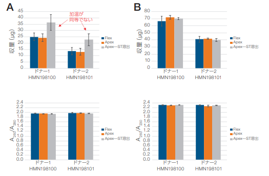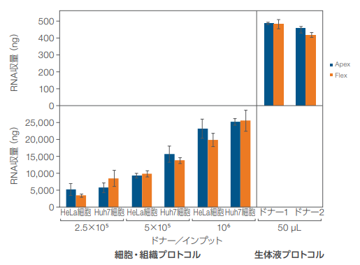図2. KingFisher FlexおよびKingFisher Apexシステムを用いたスタンダードプロトコルおよび大容量プロトコルでの RNAおよび DNAの収量。