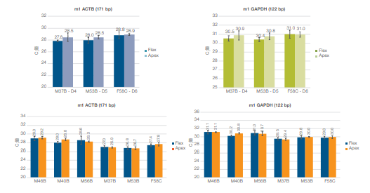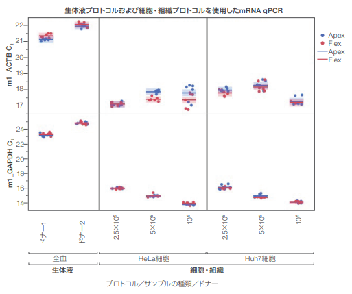 2.5×105、5×105、106個の HeLa 細胞および Huh7 細胞と、2 検体の全血サンプル(各 50 µL)から、KingFisher Apex および KingFisher Flexシステムを使用して抽出したRNA サンプルを用い、mRNA 標的(m1_ACTBおよびm1_GAPDH)のqPCR解析を行いました。