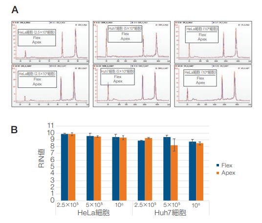 AgilentバイオアナライザとAgilent™ RNA 6000 Nanoキットを使用して、HeLa細胞およびHuh7細胞から抽出したRNAサンプルのピークプロファイルとRIN値を評価しました。図14は、KingFisher ApexおよびKingFisher Flexシステムで抽出したトータルRNAが同等のサイズプロファイルのRNAを回収できていることを示しています。RIN 値も同等であることを示しています。