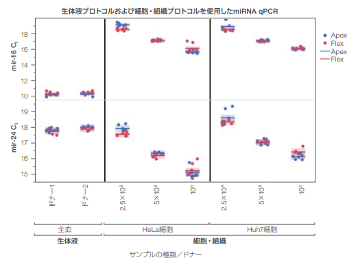 miRNA標的のqPCRでは、KingFisher ApexおよびKingFisher Flexシステムを用い、2.5×105、5×105、106個のHeLa細胞およびHuh7細胞ならびに2 検体の全血サンプル(各 50 µL)から抽出したRNAサンプルを用い、mir-16およびmir-24を標的としたアッセイを行いました。