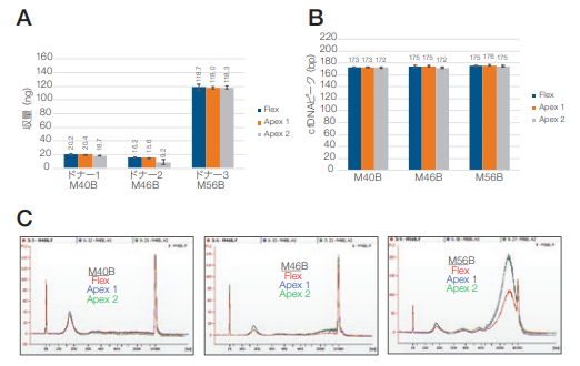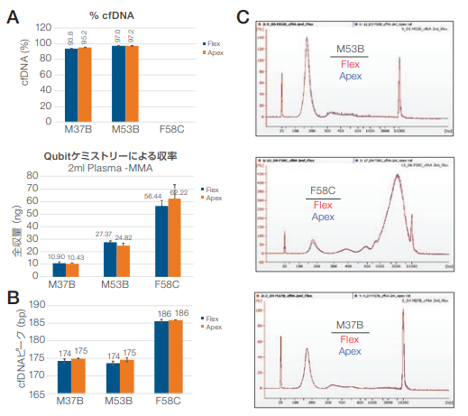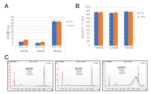 図15. KingFisher FlexおよびKingFisher Apexシステムでの3検体のサンプルから抽出したcfDNAの収量およびサイズの比較(2 mLプロトコルを使用)。