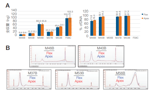 (A)6検体のサンプルのcfDNA収量を、Qubit dsDNA HS Assayを使用して解析しました。サンプルM56BおよびF58CではgDNA含有量が多いために上側マーカーが不明確となり、cfDNAの定量が不可能でした。これは、KingFisher ApexおよびKingFisher Flexの両システムで共通して生じていることから、サンプルの品質に起因するもので、装置に起因するものではないと考えられます。(B)Agilent HS DNA Assayを使用して、cfDNAのピークサイズ(bp)とプロファイルを解析しました。