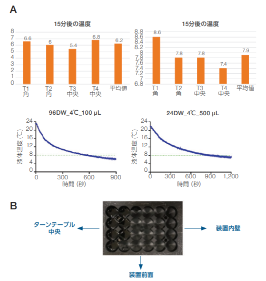 (A)KingFisher Apexシステムで4℃に設定した96ディープウェルプレートおよび24ディープウェルプレート中の100 µLおよび500 µLの水の冷却プロファイル