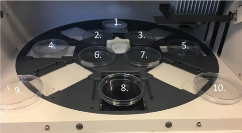 一晩培養した培養液を用いて、OD600が約 0.1になるように調製しE. coli GFP 培養を開始しました。OD600が0.58に達するまで、150 rpmで振とうしながら37℃でインキュベーションしました。10-7までの 10 倍希釈系列サンプルを調製し、各試験(Apex UV、Grant BIO UVおよびUV非照射)用のプレートに添加しました。蓋を外した10枚のプレートをKingFisher Apexシステム内に(図23)、同濃度の10枚のプレートをGrant BIOキャビネット内にそれぞれ設置し、30分間UVランプを照射しました。さらに、UVランプに曝露させない5枚のコントロールプレートをシステム外に放置しました。30分間のUVランプへの曝露後、LBプレートに蓋をして37℃で一晩インキュベーションしました。16 時間後、コロニーを計数しました。KingFisher Apexシステム内に設置したプレート上にもGrant BIOキャビネットに設置したプレート上にもコロニーは認められませんでした。一方、システム外に放置したプレートには1プレートあたり約200コロニー、平均2.1×109 CFU/mLに相当する顕著な増殖が認められました。