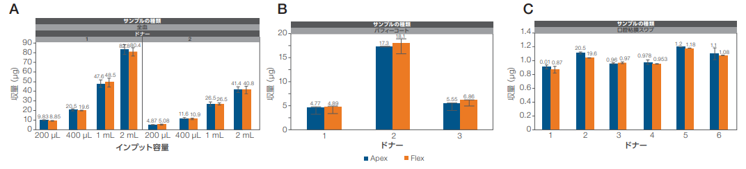 KingFisher ApexおよびKingFisher FlexシステムでMagMAX Multi-Sample Ultra 2.0 Isolation Kit を使用して、全血、バフィーコートおよび口腔粘膜スワブからの DNA の抽出を行いました。全血では、2 検体のサンプルを使用し、サンプル容量を振り(200 µL、400 µL、1 mLおよび 2 mL)、各容量に最適化されたプロトコルでの抽出を行い、DNA 収量および純度比を求めました。バフィーコートは 3 検体のサンプルを使用し、バフィーコート用のプロトコルで抽出を行いました。抽出したサンプルはQubit 4.0 Fluorometerを使用してDNA収量を測定し、NanoDrop 8000微量分光光度計を使用して純度比をそれぞれ求めました。口腔粘膜スワブは6 検体のサンプルを使用し、口腔粘膜スワブ用のプロトコルで抽出を行いました(1回の抽出に1スワブを使用)。抽出したサンプルはQubit 4.0 Fluorometerを使用してDNA収量を測定し、NanoDrop 8000微量分光光度計を使用して純度比を測定しました。図8は、全てのプロトコル(さまざまなインプット容量の全血、バフィーコートおよび口腔粘膜スワブ)における収量の詳細を示しています。全サンプルともにDNA 収量はKingFisher FlexおよびKingFisher Apexの両システム間で同等でした。