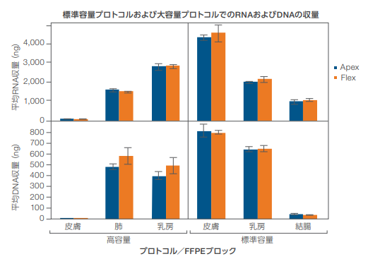 MagMAX FFPE DNA/RNA Ultra Kitを使用し、スタンダードプロトコルで、乳房、結腸および皮膚の腫瘍のFFPEサンプルからの抽出を行いました。大容量用プロトコルで、皮膚、肺および乳房の腫瘍のFFPEサンプルからのDNAとRNAの抽出を行いました。図2に、KingFisher FlexおよびKingFisher Apexの両システムから、各プロトコルを使用して得られたRNAおよびDNA の収量の詳細を示します。3 種類のサンプル全てにおいてほぼ同等の収量が得られ、標準偏差内の収量が達成されていることが分かります。