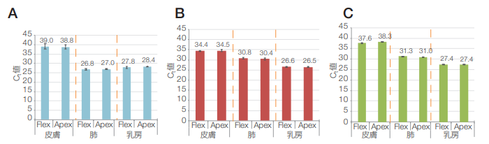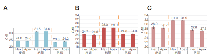 図3は、MagMAX FFPE DNA/RNA Ultra Kit のスタンダードプロトコルを使用して、皮膚、結腸および乳房腫瘍の FFPEサンプルから抽出した核酸(DNA/RNA)をqPCRで解析した結果です。KingFisher FlexおよびKingFisher Apex両システムから抽出した核酸間の Ct 値の差はそれぞれ1サイクル範囲内にあり、2つのシステムの核酸抽出が同等であったことを示しています。