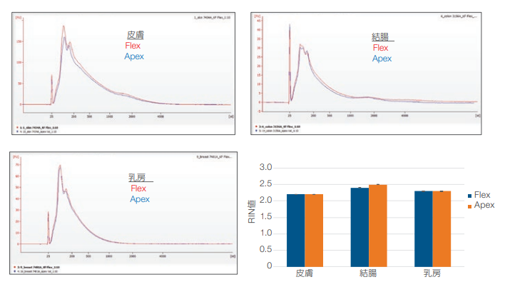 両システム間での RNA サイズのプロファイルを、Agilent™バイオアナライザとAgilent™ High Sensitivity (HS) DNA Chipを使用して確認しました。図 5 および図6は、スタンダードおよび大容量プロトコルでKingFisher Flexおよび KingFisher Apexシステムを使用して抽出した腫瘍のFFPEサンプルのRNAサイズプロファイルを示しており、いずれのサンプルにおいても両システム間で同等であることを示しています。