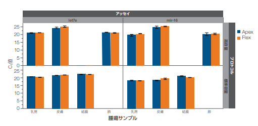 KingFisher FlexおよびKingFisher Apexの両システムを用い、スタンダードプロトコルで乳房、皮膚および結腸から、大容量プロトコルで乳房、皮膚および肺のそれぞれの FFPE サンプルを用いてmiRNA の抽出を行いました。いずれのプロトコルにおいても、TaqMan microRNA RTキットを使用してcDNAテンプレートを合成し、let7eおよびmir-16を標的としたqPCRを実行してサンプル中のmiRNAを解析しました。
