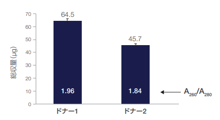 ドナー2 名から採取したサンプルをMagMAX Microbiomeキットを用いて処理しました。96ディープウェルヘッドのKingFisher Flexシステムを用いて、ビーズ式ホモジナイザーによる細菌破砕ステップを加えたプロトコルで核酸を抽出しました。グラフ中の数字はA260/A280です。
