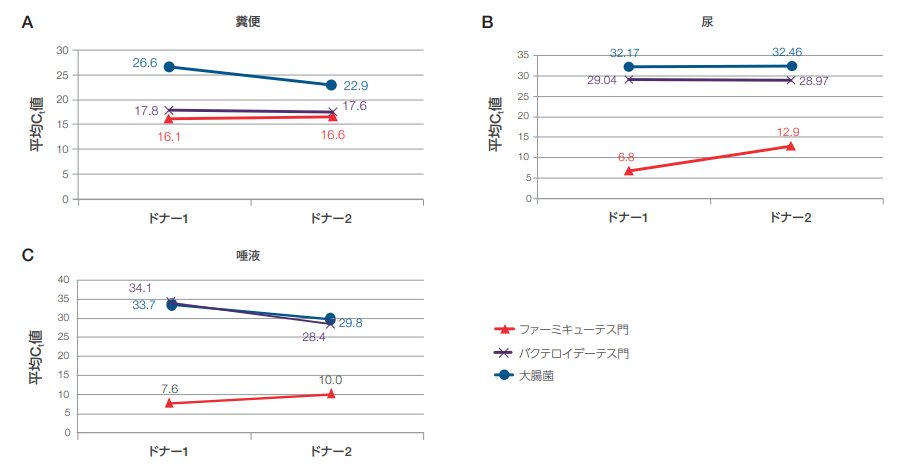 図3.ドナー2名の(A)糞便、(B)尿、(C)唾液サンプルからMagMAX Microbiome Ultra Nucleic Acid Isolation Kitを用いて精製したDNAのqPCR解析