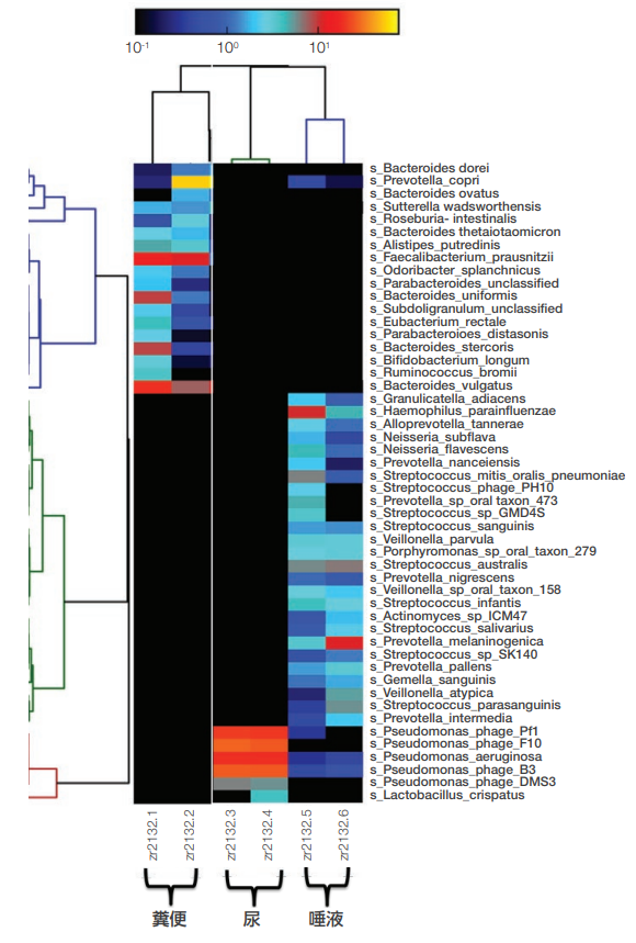 図4.ショットガンメタゲノミクスシーケンシングによるアバンダンス・ヒートマップ(糞便、尿、唾液サンプル)