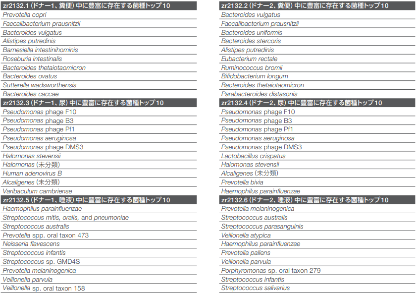 菌種レベルでの全遺伝子のメタゲノムプロファイルからは、各サンプルタイプ固有の菌叢プロファイルに含まれるさまざまな細菌ターゲットとウイルスターゲットが見て取れます。両ドナーの糞便サンプルにはバクテロイデーテス門、ファーミキューテス門、放線菌門、プロテオバクテリア門の細菌群が豊富に認められており、ドナー1 の糞便サンプルはPrevotella copri、複数の Bacteroides 種、Rothia、Faecalibacterium、Sutterella など、ドナー2 の糞便サンプルは Bacteroides、Bifidobacterium、Faecalibacterium、Rothia、Sutterella などが豊富でした。また、両ドナーともに、尿サンプルではLactobacillus、Streptococcus、Bacteroides、Ruminococcus、Bifidobacterium、Pseudomonasファージなど、唾液サンプルでは Streptococcus mitis、その他の Streptococcus 種、Granulicatella、Neisseria、Prevotellaなどが豊富でした(図5)。