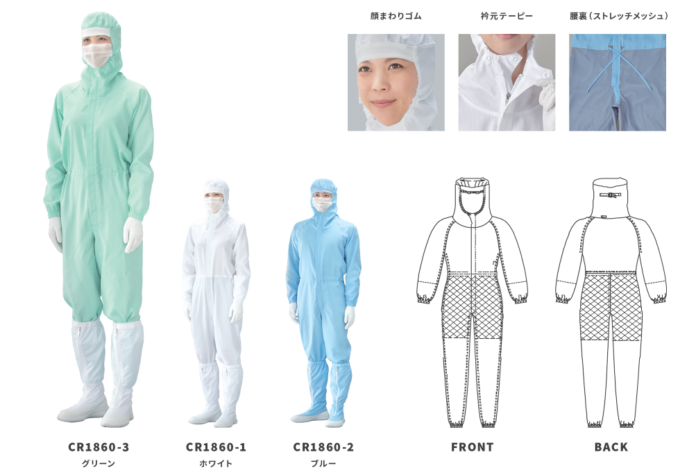快適性と防塵性を兼ね備えた男女兼用フード一体型センターファスナークリーンスーツ(腰裏付き)。