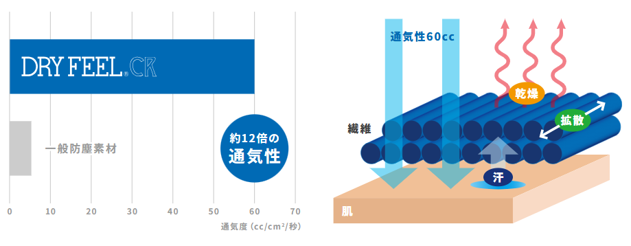- 柔らかくサラリとした優しい肌ざわりで一般的な防塵素材と比べて約12倍の通気性があります。