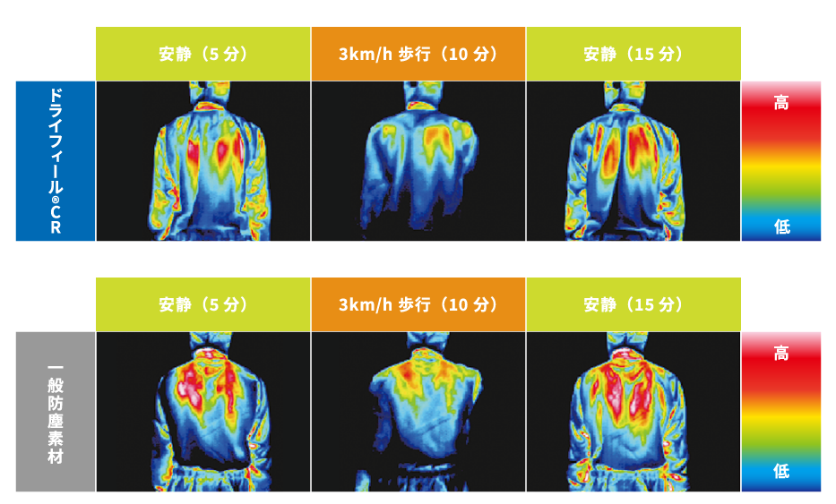 - ドライフィールCR素材は優れた通気性(60cc)により衣服内を爽やかに保ちムレ感を軽減します。