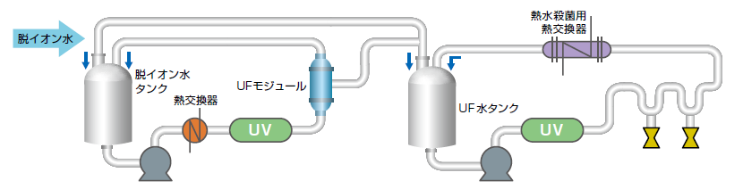 通常時、常温での循環運転を行う場合には紫外線照射器を使用し、80℃以上熱水運転により制菌します。UF 膜による高温採水、高温供給のシステムも対応可能です。