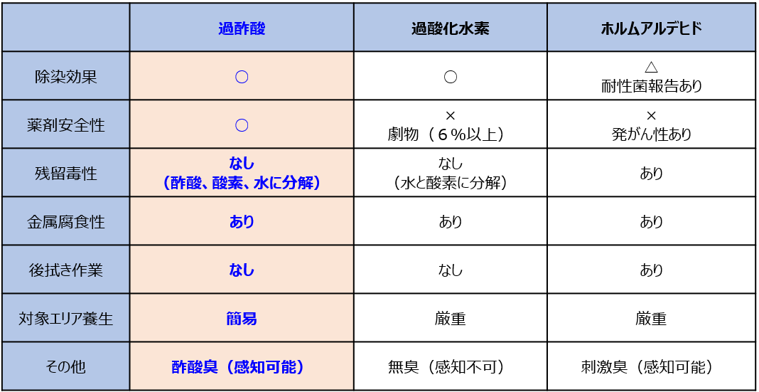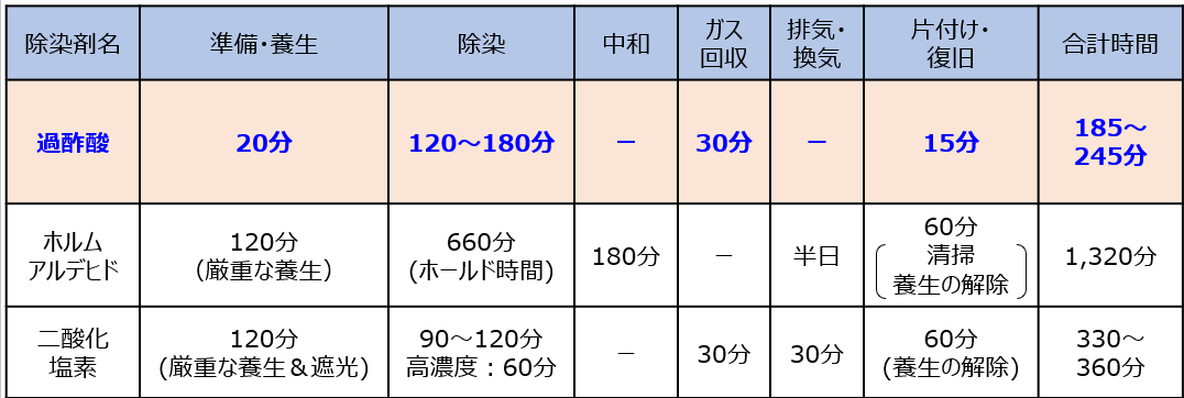 過酢酸の高い除染能力を維持しつつ、設備の腐食リスクを軽減し、簡便・短時間での除染作業が可能です。