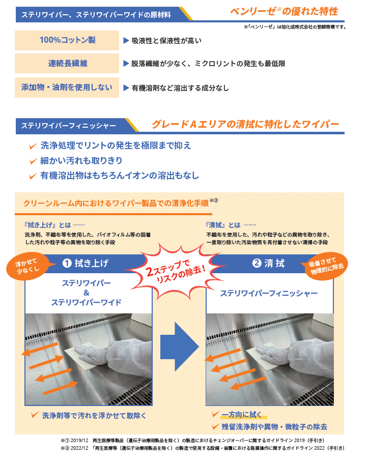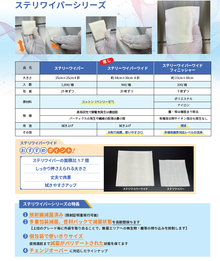 ステリワイパーシリーズ・モップクロス(多重包装・滅菌済み クリーンルーム用清掃用具 ❶発塵しにくい素材で設計 ❷優れた吸水性 ❸使いやすい個包装などクリーンルームで使いやすい製品仕様)