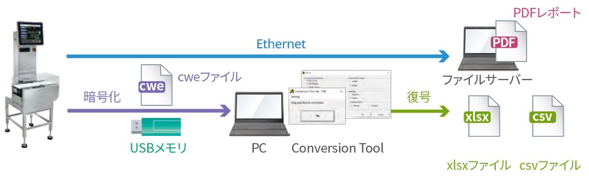 データの出力監査証跡や統計データをEthernetを介して、編集不可のPDFレポートと暗号化ファイルで出力できます。また、USBによる暗号化ファイルの出力も可能です。 |