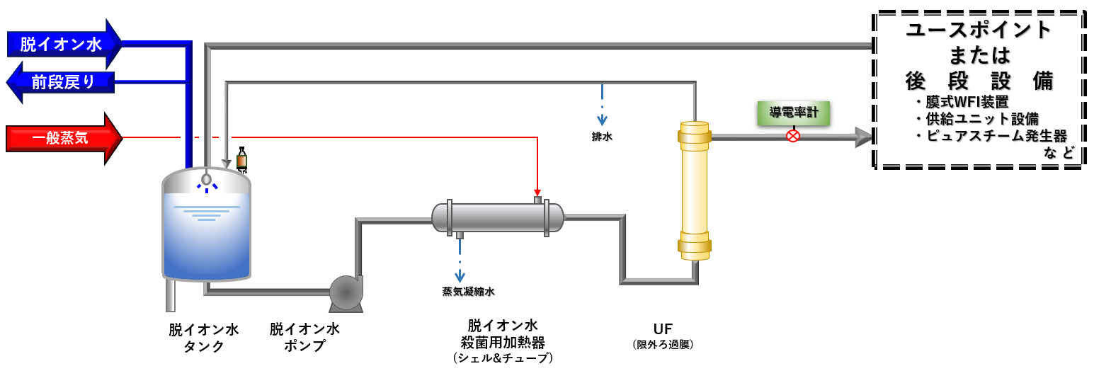 UF膜(限外ろ過膜)を用いた機器構成により、脱イオン水から生菌およびエンドトキシンを除去した