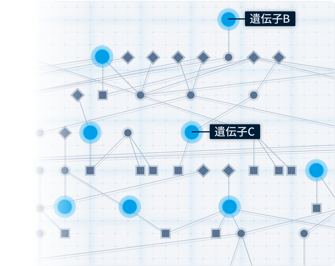 仮説生成 遺伝子ネットワークを作成し、未報告の標的分子に関する仮説を生成 |