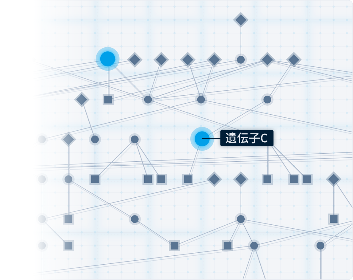 既知情報から未報告の関連性を発見する独自技術論文上では疾患との関連性が記載のない遺伝子・分子まで予測します