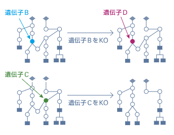 解析例 KIBITによる仮想的な実験 注目する遺伝子を仮想的にノックアウト(KO)し、パスウェイがどのように変化するかをシミュレーションします。