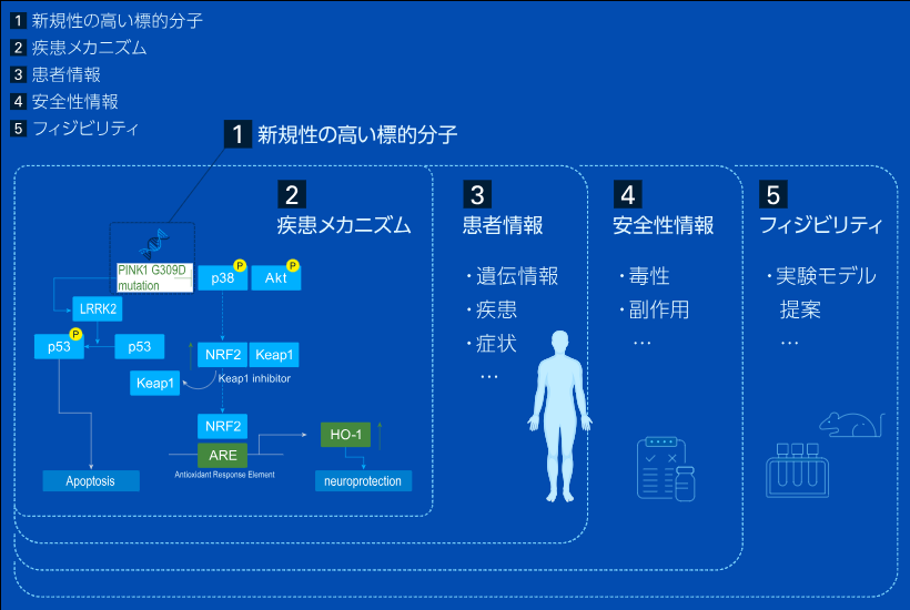 疾患メカニズム:標的分子がどのように疾患に関連するかなど
