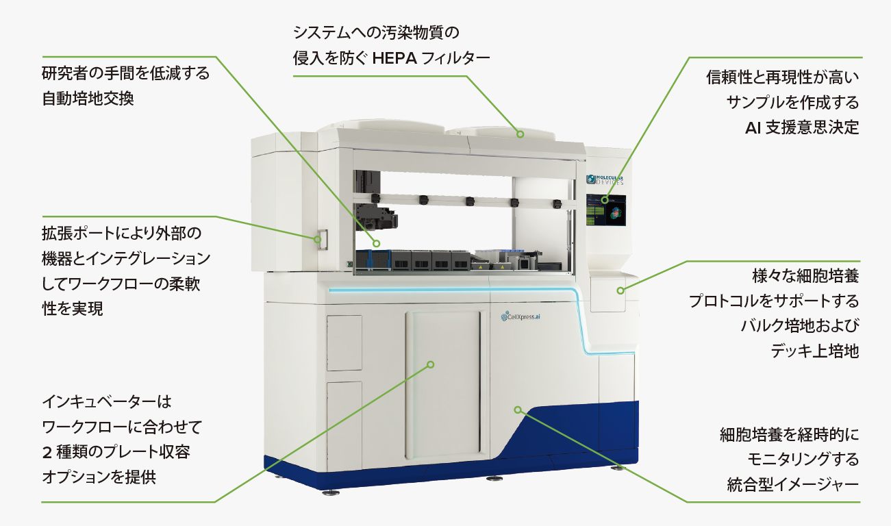 CellXpress.ai 自動細胞培養システムは、AI 駆動型細胞培養イノベーションハブとして、細胞培養のプロセスを自動化し、ワークフローを改善します。機械学習支援のモニタリング、フィーディング、イメージング、スケジューリングなどの機能によりアッセイの信頼性と再現性を高めます。
