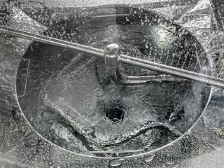 また専用バスケットのフレームは水配管で構成されており、水をフレーム内で循環させることができる為、お客様と洗浄対象の情報共有し専用バスケットの設計段階で、穴やノズルを追加することで洗浄対象の外面、内面全てにウォータージェットが当たるよう調整し、死角のない洗浄を行うことが可能です。