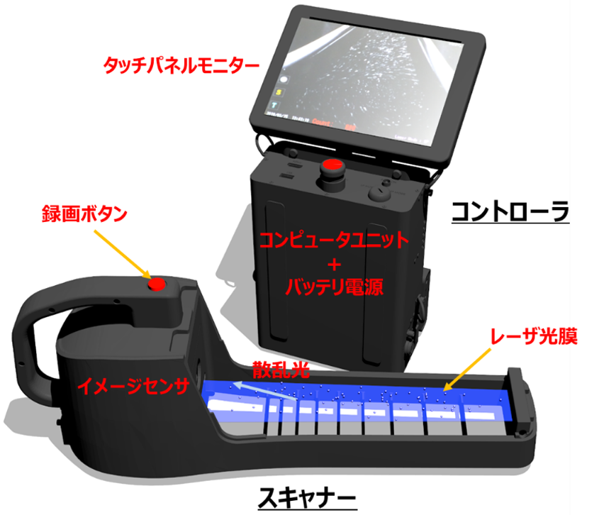 Type-Sは、片手で操作できるほど軽量な微粒子スキャナーと、専用ソフトやモニターを搭載したコントローラで構成されています。スキャナーには録画を遠隔操作できる機構が備えられており、モニターを見ながら、スキャナーを持つ手で録画・停止を操作できます。コントローラでは、専用ソフトの撮影設定や記録したデータの確認などを行いますが、モニターがタッチパネルのため、マウスやキーボードなしに操作することができます。