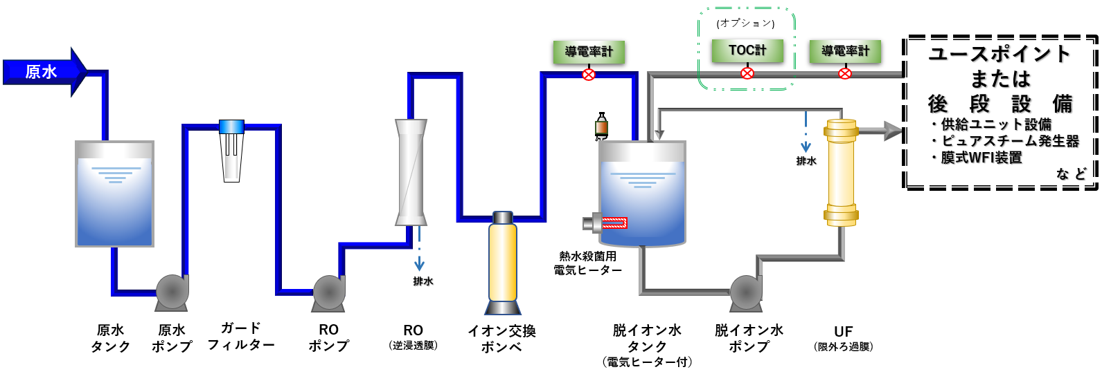 また、熱水殺菌対応のUFと電気ヒーター付きの脱イオン水タンクを採用することで、