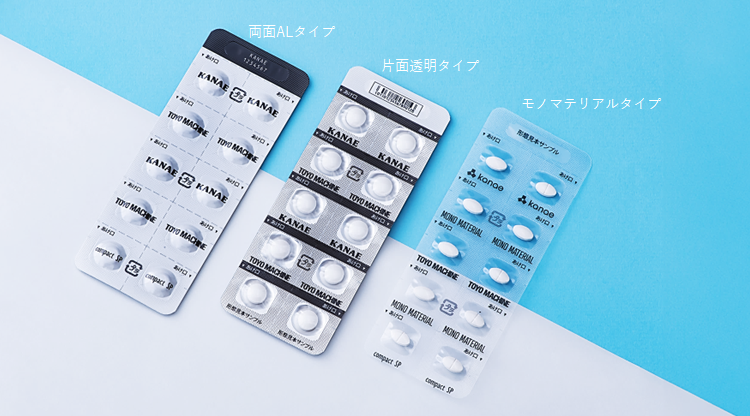 - 従来のSP包装やAL-AL PTPからサイズダウンすることができ、調剤薬局などでの保管スペースを削減します。また、モノマテリアル構成をはじめ、様々な包材を選択可能です。